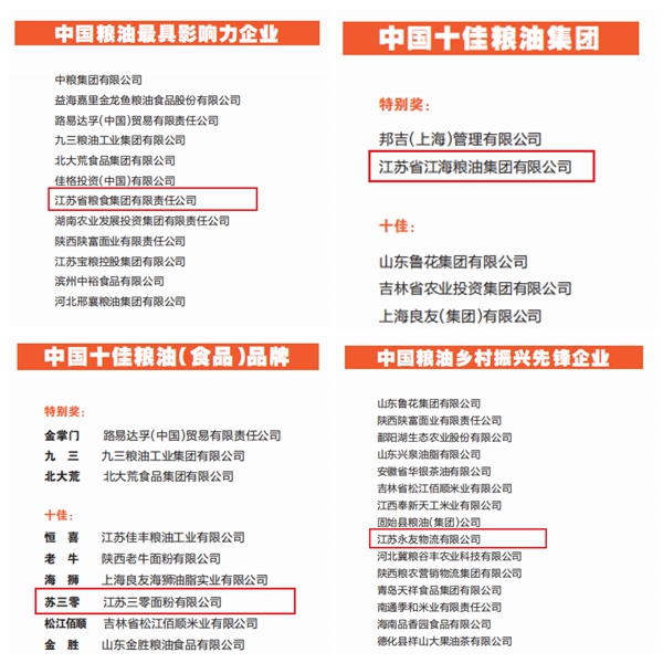 12月10日,第十二届中国粮油榜正式揭榜,省粮食集团荣获“中国粮油最具影响力企业”称号,所属江海集团荣获“中国十佳粮油集团(特别奖)”称号、三零面粉公司“苏三零”品牌荣获“中国十佳粮油(食品)品牌”、永友物流公司荣获“中国粮油乡村振兴先锋企业”称号。