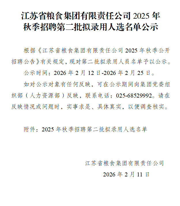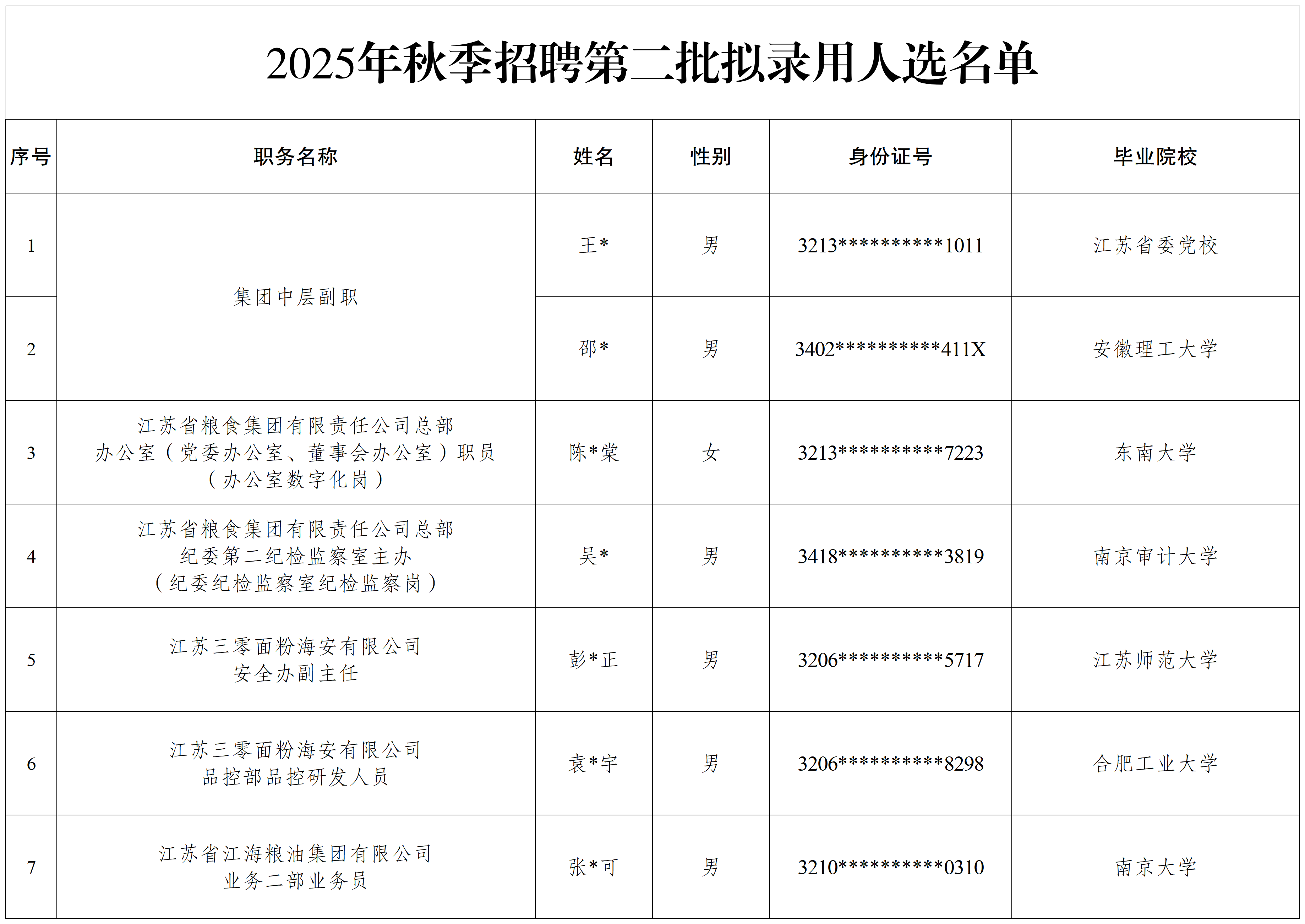 江苏省粮食集团有限责任公司2025年秋季招聘第二批拟录用人选名单公示
